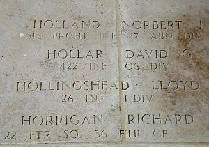 Pfc David G. Hollar was a stock clerk before he enlisted in Cleveland, Ohio on 28 September 1943.He was taken prisoner on 16 December 1944 when his unit was located in the vicinity of Schönberg, Belgium.