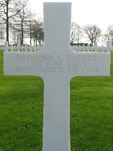Pfc Raymond L. Cassidy was a railroad clerk before he enlisted at Fort Devens, Massachusetts on 10 March 1944.Source of information: Peter Schouteten, Laurie Albert (granddaughter) and Ralph Peeters, www.archives.gov - WWII Enlistment Record, www.ancestry.com - Headstone and Interment Record, Family Trees