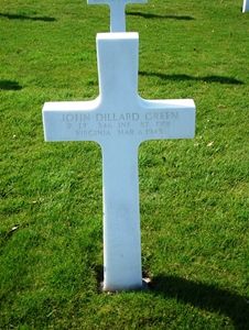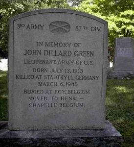 Lt. John D. Green graduated from Virginia Polytechnic Institute in 1934 where he received his degree in Agronomy. He was employed at the Virginia Agricultural Extension Division.He was initially buried at the Temporary American Military Cemetery in Foy, Belgium.