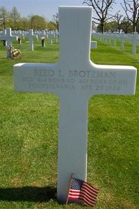 Sgt Reed L. Brotzman enlisted in Wilkes Barre, Pennsylvania on 2 March 1943.He was married to Shirley May Whipple on 4 November 1943 in South Dakota. Both were graduates of the Laceyville High School. His daughter was born on 16 August 1944.