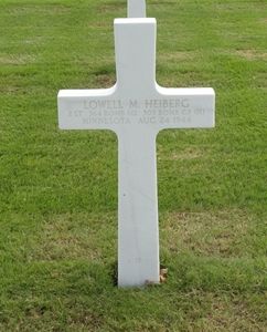 Lt Heiberg graduated from Twin Valley High School. He attended the University of Minnesota until he joined the Air Corps of the U.S. Army Reserve in Minneapolis, Minnesota on 15 December 1942. He graduated as a pilot at Fort Sumner, and was stationed in Europe only a short time.As the plane was headed back, it was hit by enemy anti-aircraft fire. Due to the heavy damage to "Graham Cracker", it crashed in Barnstaedt (West of Merseburg) at 12:30 o'clock. Seven of the crew members were found dead, two had parachuted out before the crash (they were captured by the Germans). The seven dead crew members were buried on 25 August 1944 in the Village Cemetery at Barnsteadt.