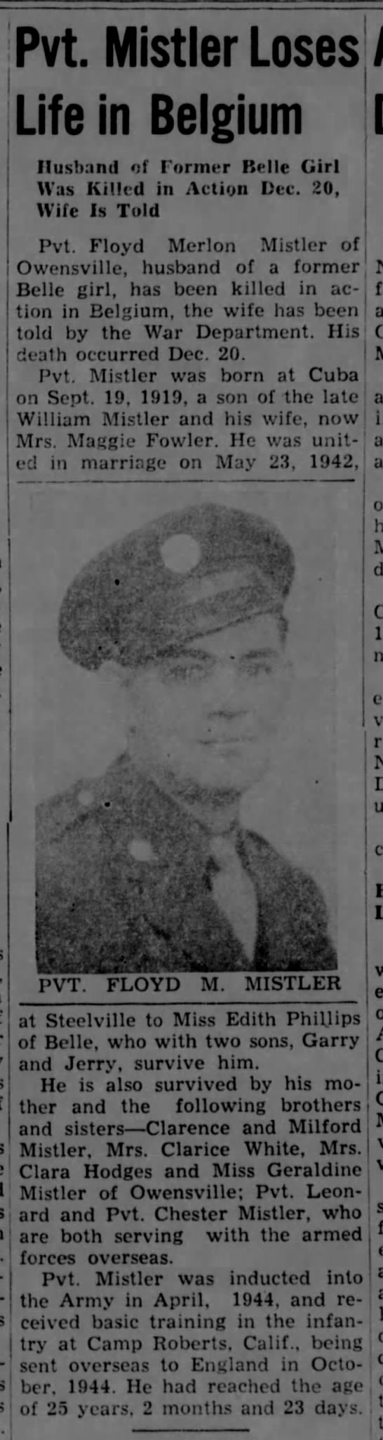 Pvt Floyd M. Mistler enlisted at Jefferson Barracks, Missouri on 14 April 1944 and was sent overseas in October 1944.Documents