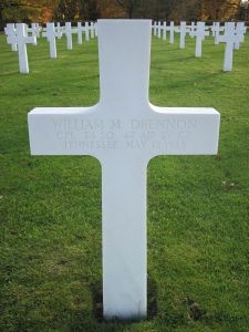 Cpl William Drennon enlisted on 11 May 1943 at Camp Forrest, Tennessee.On 13 May 1945 a formation of two B-26s flew on a low-level formation navigation flight. The pilot of the lead airplane, 1st Lt Doming, Jr., stated that he had advised 2nd Lt Whitehead, pilot of the ill-fated plane, not to attempt to fly formation due to the turbulence that day. Lt Whitehead dropped back and to the right but kept his sight of the lead plane. As they flew along, the waist gunner of Lt Doming's aircraft stated to him over the interphone that he could see Lt Whitehead buzzing villages and surrounding terrain. During the process of buzzing, Lt Whitehead's right wing of the aircraft struck a tree, causing the airplane to swing to the right. His altitude at this time was so low, he was unable to right the plane and the right wing struck the ground at a great speed, causing the crash. Parts of the plane were strewn over a great forward distance, carrying all the crew members to their death.