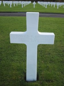 2nd Lt Donald T. Drugan enlisted in Portland, Oregon on 25 November 1942.A/C #189 was hit by flak 6 miles south of Koblenz at 1245 hours. Hit was between #3 and #4 engines which set his right wing on fire. No.4 engine was knocked out. A/C stayed level for 10 seconds, then made a slow right turn losing altitude, and trailed formation for about ½ mile. A/C then lost right wing, going into flat spin and disintegrating. One chute was observed, with possibly 4 delayed jumps. Four men survived and were made POW, the remaining 5 crew members were KIA.