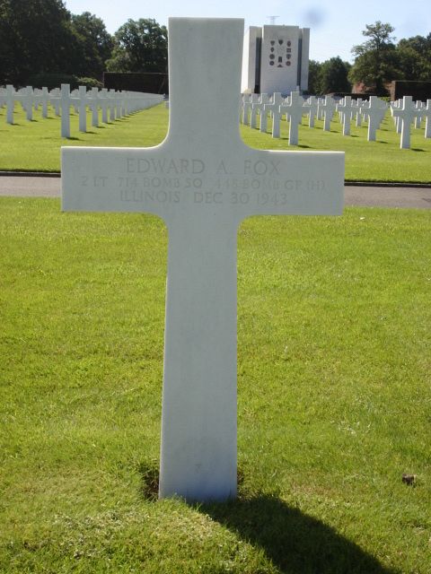 2nd Lt Edward A. Fox enlisted in Chicago, Illinois on 16 July 1941.A/C 41-28599 was shot down over San Quentin, France. Five men were able to bail out prior to the crash. Three of the five crew members who stayed on board were killed in the crash.