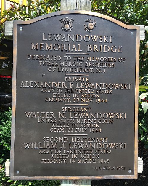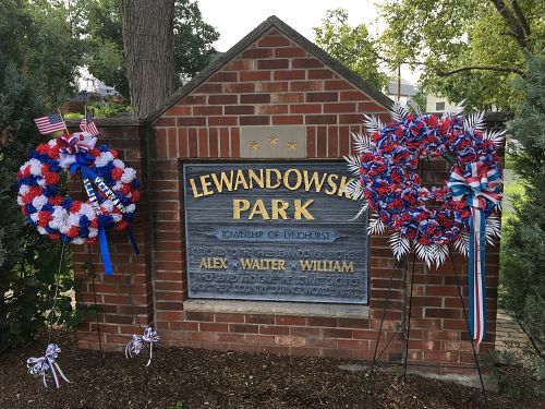 A monument, featuring a large plaque and three gold stars, can be found in the Lewandowski Park in Lyndhurst, New Jersey.