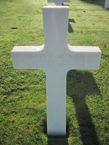 1st Lt James P. Mc Avoy enlisted at Camp Upton, Yaphawk, New York on 4 March 1942.He was KIA while on a mission to bomb the submarine pens at Wilhelmshaven, Germany. His plane was hit over the target by fighter attacks. One section of the wing was on fire and fell off. The plane went down west of Wilhelmshaven. 7 of the 10 man crew were KIA, 3 survived to became POWs.