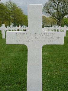 James J. Slaysman worked for the city of Baltimore. He enlisted in Baltimore, Maryland on 6 February 1942.Pfc Slaysman was initially buried at the Temporary American Military Cemetery of Molenhoek, near Nijmegen in the Netherlands.