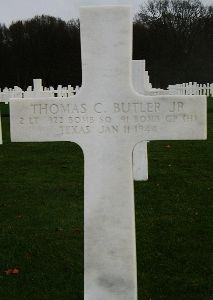 Thomas Butler graduated from Graham High School and attended John Tarleton Agricultural College where he played football.Re-grouping still had not been completed and Lt L.C. Page' plane and crew would become the 5th loss for the 91st Bomb Group. Lt Page was flying the B-17 'Chief Sly's Son' in the 2nd element of the Lead Squadron. Troubles began during severe attacks about 20 minutes prior to the target. 20mm shells started a small fire, apparently in the left wing fuel tank. The fire remained quite small until after the target, when the formation lowered altitude by about 2000 feet. Then the fire enlarged, probably due to increase in the atmosphere's oxygen supply. Enemy aircraft then scored more hits and controles became sluggish. At that time the engineer, Sgt Arthur R. Ginder, was probably killed. Bailing began at about 1500 feet and 6 men bailed out successfully. Lt Page, Lt Stevenson and Co-Pilot Lt Thomas C. Butler Jr. were preparing to bail via the nose hatch when the plane exploded in the air. Page and Stevenson were blown clear, but apparently Butler was blown further back into the plane. He and Sgt Ginder did not survive the crash. The plane crashed at 12:45 hours at Schemde near Steinfeld, about 10 miles northwest of Dummer lake.