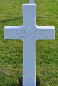 Pfc Orville Shavey attended the University of California, College of Agriculture for one year.He enlisted on 13 April 1943 at San Francisco, California. He joined his unit from a replacement depot on 29 August 1944.
