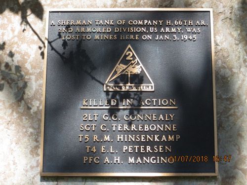 The Sherman tank, he was commanding, had been inching its way down the road when it skidded on the hard-packed ice and snow off the edge of the winding road. Upon doing so, it struck a daisy chain of mines that detonated simultaneously blowing the tank turret clear across the road, killing the entire crew and the GI's of the 84th Infantry Division who had been hitch-hiking on the tank. This tragedy is remembered with a monument at the place of the incident.