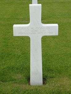 Pfc Paul W. Conrad enlisted at Camp Lee, Virginia on 4 February 1942.During his service, his wife requested a divorce, which, according to his mother, he was happy to grant. It is not clear that the divorce had already been arranged when he died. Nevertheless, his mother was considered his closest relative to decide where he would be permanently buried. At that time it was apparently not possible to find out his wife's address.