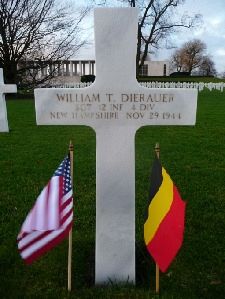 William Dierauer enlisted in Manchester, New Hampshire on 10 November 1942. He was sent overseas in May 1943 and first served as an instructor England.He was killed by shell fragments in his legs