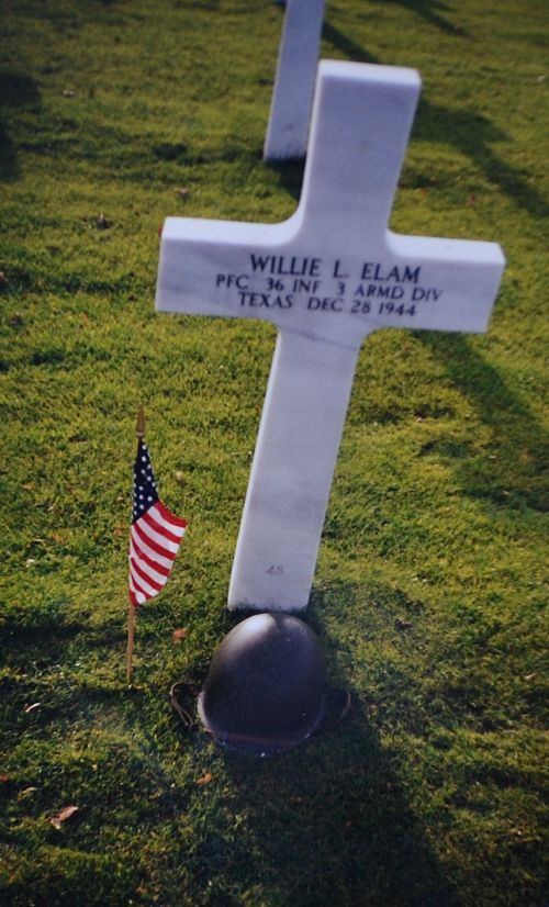 Pfc Willie L. Elam enlisted on 17 June 1941 in Dallas, Texas.He was killed in his jeep, together with his best friend T/Sgt Elmer Scherrer. They were both buried at the temporary American Cemetery at Fosses-La-Ville Block L, Row 10, Grave 198 in 1947, they were given a final resting place at Henri-Chapelle.