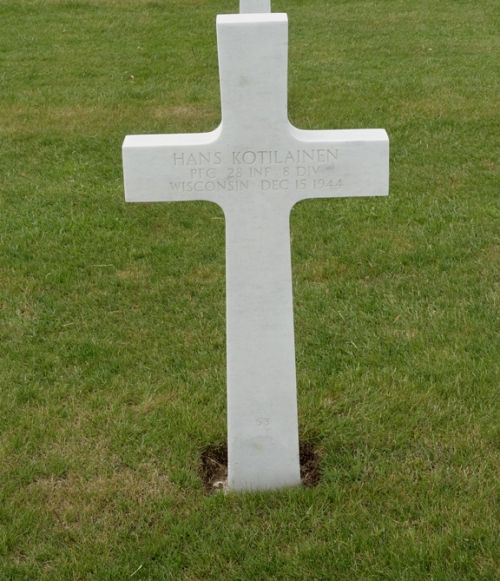 Pfc Hans Kotilainen enlisted in Milwaukee, Wisconsin on 4 November 1942.In 1925 he came to Milwaukee from Finland with his family. He was a very meritorious painter who won several prizes. He was a member of the Wisconsin Painters and Sculptors and the Milwaukee Printmakers. His paintings have been shown at many locations such as the International Water Color show in Chicago, the New York World's Fair, the Renaissance Society of the University of Chicago, three one-man shows at the Layton Art Gallery, the Wisconsin Salon of Art in Madison and the 1943 Wisconsin Painters and Sculptors show at the Milwaukee Art Institute. Many Wisconsin cities have had expositions of his work. His work has also been exhibited in England and northern Ireland. While on maneuvers in the Arizona desert, Pfc Kotilainen painted 70 water colors of the desert. He used his helmet as a water bucket and his trench shovel as a palette.