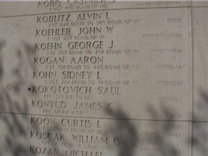 In March 1945, Lt Kogan volunteered for a flight over Germany, although he had met his quota. The aircraft received a direct hit by flak while on the bomb run. The right wing came off, and a large hole was observed in the left wing. The ship blew up as it crashed into the water. The entire crew is listed on the Walls of the Missing at Margraten.