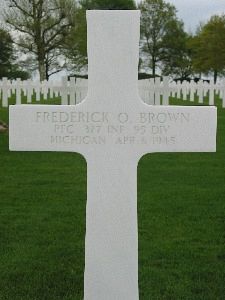 Pfc Frederick O. Brown graduated from Brooklyn Technical High School and was employed by the Standard Oil Company.He was initially buried in a temporary grave at Margraten on 11 April 1945. After being disinterred and after the cemetery was given a permanent status, he was given his finale resting place on 7 January 1949.