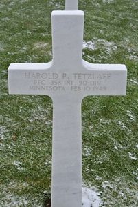 Pfc Tetzlaff enlisted and was inducted into the United States Army, 24 March 1942. His first training was at Camp Barkley, Texas, where he was enrolled in Company B, 358th Infantry Regiment. From there he was transferred to Shreveport, Louisiana. In April 1944 he was transferred to Fort Dix, New Jersey. From there he embarked for overseas duty. He landed in England in April 1944. On D-Day in June 1944 he took part in the invasion of Europe. Being wounded, he was hospitalized for two months; he returned again to combat duty 31 August 1944. On 10 February 1945 Pfc Tetzlaff was again wounded in action. Although hospitalized, he died the same day in a hospital in Belgium.Source of information: Astrid van Erp, www.wwiimemorial.com, www.ancestry.com, Tetzlaff Family Tree