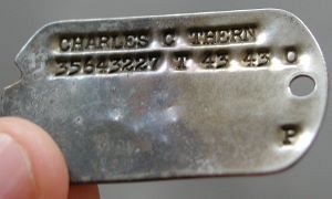 T/5 Charles C. Thern enlisted in Huntington, West Virginia on 7 December 1942.Photo Dog tag: Dog tag recovered in August 2000 near the Losheimergraben crossroads among material belonging to Company I, 394th Inf Reg, 99th Inf Div.
