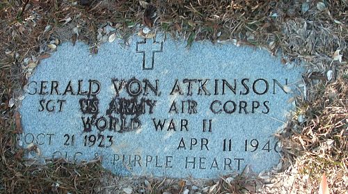 S/Sgt Gerald V. Atkinson was a sales clerk. He enlisted at Fort McClellan, Alabama on 3 September 1943.He was the original waist gunner on another airplane on which he flew five missions. Then his crew position was changed from waist gunner to spot jammer, voice interpreter and radio control measureman and he flew in these positions for 15 missions with 11 different pilots.