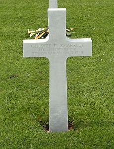 Chester P. Zmarzley enlisted in Allentown, Pennsylvania on 21 September 1942.He was wounded in action a first time on 16 July 1944 for which he was awarded the Purple Heart Medal a first time. After recovering he rejoined his unit.