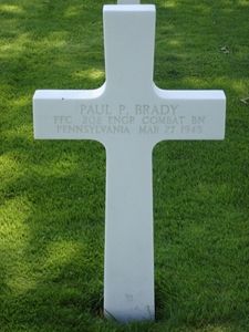 Pfc Paul P. Brady worked in a food processing factory.He enlisted in Wilkes-Barre, Pennsylvania on 2 February 1943. After training at Camp Breckenridge, he was sent overseas in February 1943.