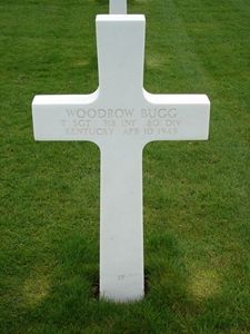 T/Sgt Woodrow Bugg enlisted in 1942 and was snet overseas in June 1944. He was wounded in action six months later ant was sent home of a 30-day rest. After returning to the front he was only ten days in action when he was killed.In June 1945 he was posthumously awarded the Distinguished Service Cross Medal for his heroic, single- handed assaults on German enemy machine gun positions which menaced the advance of his company`s attack on Schmira, Germany. He ordered his men to hit the ground when two well-concealed enemy machine guns opened up on them. Instantly realizing that only a skillfull flanking movement could eliminate the lethal fire, shooting his rifle from the hip, he advanced within 30 yards of the Wehrmacht guns and attacked the first emplacement with such fury that the gun was silenced in a matter of seconds and the entire crew was either dead or wounded. The target of the second gun, he fell gravely wounded amidst a hail of lead, but managed to struggle to his feet and fight on with his men to wipe out the second machine gun position before he died.