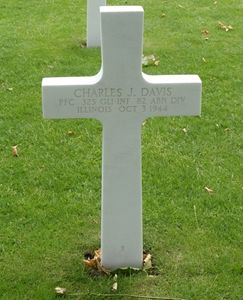 Pfc. Davis was first buried at the Temporary American Military Cemetery of Molenhoek near Nijmegen.Pfc Charles J. Davis is remembered at Maplewood Cemetery in Saint Elmo, Fayette County, Illinois.