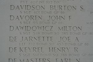 S/Sgt Milton Dawidowicz was a toolmaker before he enlisted in Baltimore, Maryland on 5 March 1943.Aircraft 43-38639 was flying the lead position of the low section, low squadron. This aircraft was struck from beneath by B-17 #43-38210. A portion of the aircraft, striking the airplane, lodged in the under portion of 43-28639 and the pilot apparently lost complete control of the aircraft. Witnesses state that it began to lose altitude, under partial control, with the pilot swerving his aircraft in an attempt to dislodge the vertical stabilizer of the aircraft that had collided with him, and which had lodged in the forward under portion of 43-28639. In doing so, aircraft 43-28639 broke apart at the beginning of the tail section and went into a flat spin. From four to six parachutes were reportedly observed leaving this aircraft. The formation was flying over the North Sea at the time, and the parachutes and aircraft hit the water."