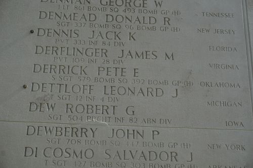 Dettloff’s name is recorded on the Walls of the Missing at Margraten Cemetery. A rosette has been placed next to his name to indicate he has been accounted for.