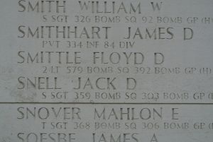 S/Sgt Jack D. Snell graduated from Smith-Cotton High School in 1937. He was with the circulation department of the Sedalia Democrat newspaper.He volunteered for the Air Corps of the Army of the United States Jefferson Barracks, Missouri on 6 January 1942.