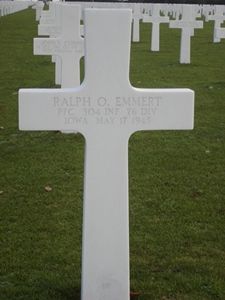 He was awarded the Silver Star Medal posthumously. The citation cited: His platoon was dug in at a point so thickly wooded that it became necessary to estabish an observation post across an open field in the edge of the woods know to be occupied by the enemy. Pvt Emmert began to lay wire to the newly selected position across the open field which was being subjected to heavy enemy machine gun fire. Disregarding warnings of danger, he crawled forward and paused only after phone contacts had been made. Uninjured, he operated his phone, enabling effetive mortar fire to be brought upon the enemy.