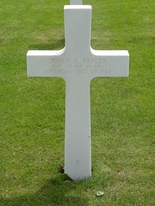 Pvt John A. Farley entered active service October, 1943, received infantry training at Camp Blanding November 25, 1943-April 9, 1944, went overseas June 13, 1944.John graduated with a B.A in 1939 from Yale. He attended Harvard Graduate School of Business Administration from 1939-1941 and had been working in the aircraft division Ford Motor Company in Detroit,Michigan when he enlisted.