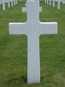Pvt Edward R. KnoxHe was awarded the Silver Star Medal posthumously. The citation cited: For gallantry in action again the enemy near Wesel, Germany, on 24 March 1945. Upon landing behind enemy lines in the airborne operation across the Rhine River, Pfc Knox, with gallantry and utter disregard for his own safety attempted to rescue a wounded comrade from an exposed position very near an enemy held house. Although the attempt was unsuccessful, his unselfish action exemplified the highest sense of duty and was in keeping with the highest standards of military conduct.