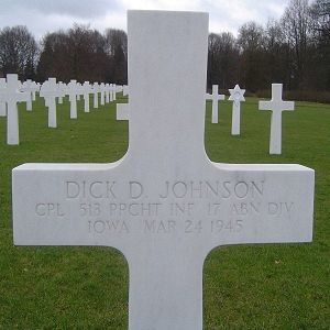 Cpl Dick D. Johnson enlisted at Camp Dodge, Herrold, Iowa on 19 March 1943.He was a passenger of C-46D #44-77595, which was shot down by anti-aircraft fire on the aproach to the dropzone and exploded when hitting the ground.