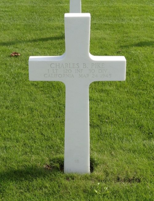 1st Lt Charles B. Pike attended Los Angeles High School and attended the University of California at Los Angeles (UCLA) here he played football.He was awarded the Silver Star Medal posthumously for actions on 23 February 1945. The citation stated: Lt Pike and four comrades volunteered to take an enemy strongpoint located in a railroad station, despite two platoons not having been able to capture it. Leaving men to cover their advance, they made their way to a position where they knocked out an enemy automatic weapon. Firing and hurling hand grenades, Lt Pike and his comrades rushed the building through a stream of small arms fire and crashed through the doors. Their sudden assault so startled the enemy that their resistance completely collapsed and thirty-three surrendered. Their gallant actions allowed the attack to continue forward.
