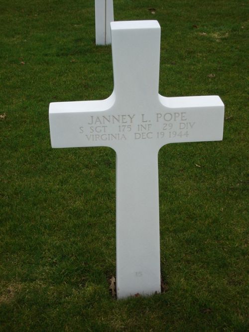 S/Sgt Janney L. Pope enlisted in Berryville, Virginia on 3 February 1941. He landed on Omaha Beach on D-Day.S/Sgt Janney L. Pope first buried at Temporary American Military Cemetery Margraten, Netherlands Block J, Row 3, Grave 66.