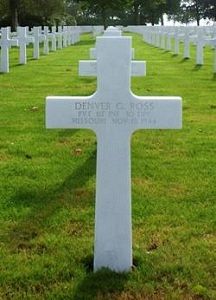 Pvt Denver G. Ross enlisted at Fort Leavenworth, Kansas on 25 March 1944 and went overseas in August 1944.He is remembered at Barnes Cemetery, Mercer County, Missouri.