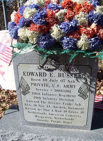 Pvt Edward Russell joined his unit from a Replacement Depot on 26 October 1944.He is remembered at the Woods Cemetery, Crawford County, Arkansas