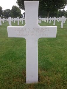 Pfc Julius Verlinde landed at Omaha Beach on D-Day. He was seriously wounded in action on 15 July 1944.His father and mother were Belgian emigrants, his father was born in Wingene and his mother in Ooigem. His father emigrated to the USA on 17 March 1911 on board the Lusitania. Later his wife and five children followed.