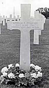 Capt William Chaplin was awarded the Bronze Star Medal, a first time for heroic achievements in military operations against the enemy near Hambye, France, on 30 July 1944. The citation for this Bronze Star mentioned the following: "When his company encountered heavy enemy opposition and a number of men were seriously wounded while protecting engineers constructing a bridge, Capt Chaplin skillfully maneuvered his unit into a more advantageous position and with effective rifle fire repulsed the hostile attack."He was awarded the Bronze Star Medal a second time posthumously for his action during the battle for Aachen. The citation reads, "Despite heavy mortar fire, apt Chaplin moved fearlessly about exposed ground and directed the succesful defense of a tactically important terrain feature. In the performance of his heroic mission, Capt Chaplin was mortally wounded."