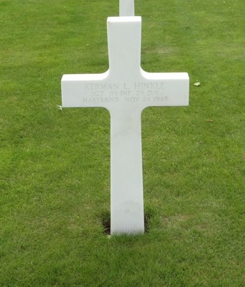 Sgt Kerman L. Hinkle enlisted at Fort George G. Meade, Maryland on 25 March 1941. He joined his unit from a replacement depot on 21 November 1944.While in barracks in Bremen, Germany Sgt Hinkle heard two soldiers fighting outside. As an NCO he was duty bound to resolve the situation and went outside to break up the fight. While trying to break up the fight, Sgt Hinkle was shot by an unknown soldier. He died from his wounds