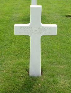 Pvt George Mangan graduated from St. John's High School and was employed by the J.C. Penny Store in Pittston. He also served as assistant chief of the fire department in his hometown.He enlisted on 22 July 1943 at Wilkes Barres, Pennsylvania. He joined his unit from a replacement depot on 9 October 1944.