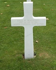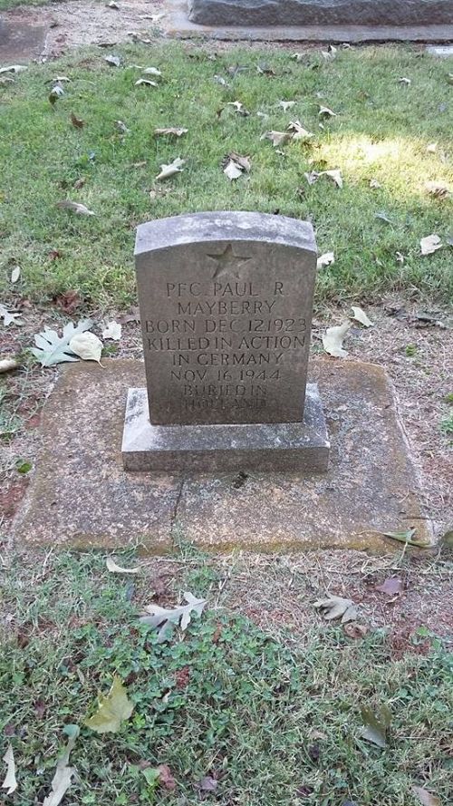 Pfc Paul Mayberry enlisted on 19 March 1944 at Fort Bragg, North Carolina. He joined his unit from a replacement depot on 9 October 1944 and was promoted to Private First Class on 10 November 1944.Pfc Mayberry is remembered at Hebron Baptist Church Cemetery in Statesville, Iredell County, North Carolina.