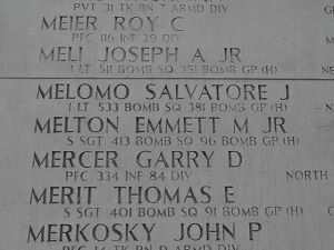 S/Sgt Emmett Melton volunteered for the Air Corps of the Army of the United States on 2 October 1942 at Fort Benjamin Harrison, Indiana.His aircraft was attacked by enemy aircraft. He died from anoxia before the plane crashed. It was his fifth mission.