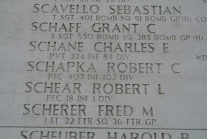 Robert Schapka was sent to Purdue University for officer studies. He was removed from that program and placed in the infantry as a replacement.The circumstances of his death are bitterly ironic and tragic. The characteristic sound of the BAR was known to attract enemy gunfire. He received a wound to the shoulder. It was not serious and he received first aid. Because no medic could get to him at the time, he was placed in a foxhole along the road to await help. An American tank was seen to accidentally drive over the spot. Although a search was made, no remains were ever found. He was declared missing in action and later declared dead.