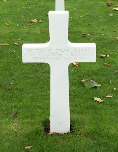 He was initially buried at the cemetery of Zwaagwesteinde on 16 December 1943. The villagers, who wanted to attend the funeral, were not allowed into the cemetery; they stood in the neighborhood. During the ceremony, they started singing the Dutch national anthem. A German soldier got furious and fell into a waterway, causing the crowd to cheer. The villagers later placed a stone on the grave. There is a war memorial in the Schoolstraat upon which Sgt. Spangenberg is remembered. He was reburied at Margraten on 8 November 1945.
