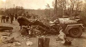 Statement from George F. Schneider:"Our Troops had moved ahead and we followed. A break had been made in the German line and Captain Christy told me to take one of the runners with me and return to the rest of our company still at the farmhouse and guide them through the opening. Storm volunteered as well as Ken Bedford who was standing nearby. After a short discussion it was decided that Storm would accompany me. Before we could leave Captain Christy decided to come along. He sat in the front seat and Storm sat in the back over the right wheel. The pontoon bridge was now completed and tanks were rolling across in large numbers. We had already radioed for tanks to assist us in advancing through the break in the German line. As we traveled down a gently slopping gravel road we could see the dust from approaching tanks. As we approached the first tank Storm said his last words, "Beaucoup dust " The second tank was approaching us and, when it was about 10 feet from us it struck a mine with the outside edge of its left track. Most of the German mines were teller mines and were shaped like a large two-layer cake. These were their most destructive mine, and being made of metal and packed with powerful explosives, they were lethal. These could be dedected with mine detectors and the road had been swept by our antitank group and declared clear of mines. The one detonated by the approaching tank was made of plastic and could not be dedected with a mine detector. It was an elongated box pack with 10 pounds of explosives and often contained a timer so that several vehicles could pass over it without detonating it then later on it would explode and create disruption perhaps in a rear column. We had traveled this road on our way to the front and had avoided tripping any mine so these had obviously had timers on them or else all vehicles had miraculouslyavoided them.The tank struck the mine on its far left and most of the explosion was expended on the roadway. The tank suffered no damage and never slowed down. Antitank mines were not necessarily designed to destroy tanks. To disable a tank by blowing off or damaging one of its tracks was the purpose of a mine. By thus disabling movement of a tank it became a sitting duck for an antitank gun to finish it off. My first reaction from the explosion 10 feet away was to stop but before I could react iIhad progessed to a line in the road where a string of mines has been laid. I hit one with the right rear wheel and was blown over the steering whee and to the left front. Captain Christy was blown straight forward and landed about 75 feet away. He was killed outright. Storm landed between Captain Christy and the wreckage and had one leg completely blown off. He had been sitting directly over the blast."