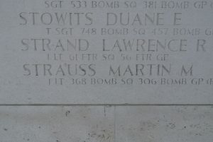 The entire crew of ten was killed. Nine are remembered on the Walls of the Missing at Margraten, one, William R. Payne, is remembered on the Walls of the Missing at Cambridge.