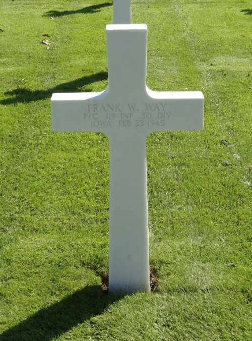 Private Way enlisted 26 August 1944 at Fort Snelling, Minnesota and was sent overseas on 1 January 1945.He was in Belgium on the 26th and the last letter his wife received was written 22 February, the day before his death, in which he stated that he wanted her to remember what he bought her for her last birthday. Mrs Way stated that his gift was a large bottle of cologne and she thus surmised he was stationed at Cologne, Germany. Frank attended the Waterloo schools and worked at the Rath Packing Company before his enlistment.